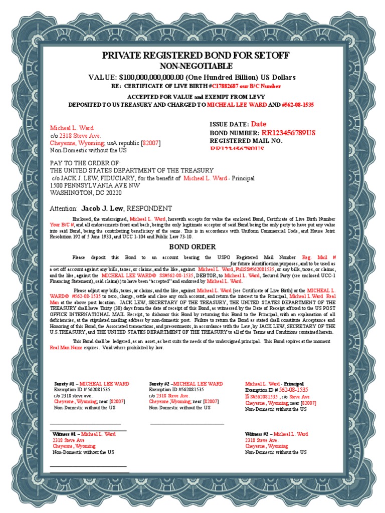 B Private Registered Bond For Setoff Birth Certificate Bond 1MLW
