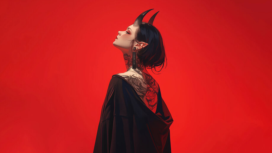6832b Anime, Girl, Demon, Horn, with, Tattoo, 8K Wallpaper PC Desktop