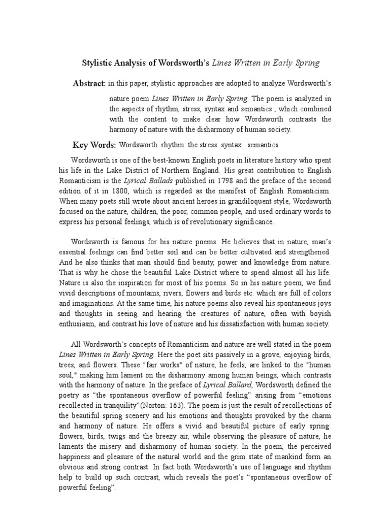 In the poem lines written in the early spring, william wordsworth talks about the beauty of. In the poem lines written in the early spring, william wordsworth talks about the beauty of. Lines written in early spring has a rather simple form: 'lines written in early spring', written by the romantic poet william wordsworth,.