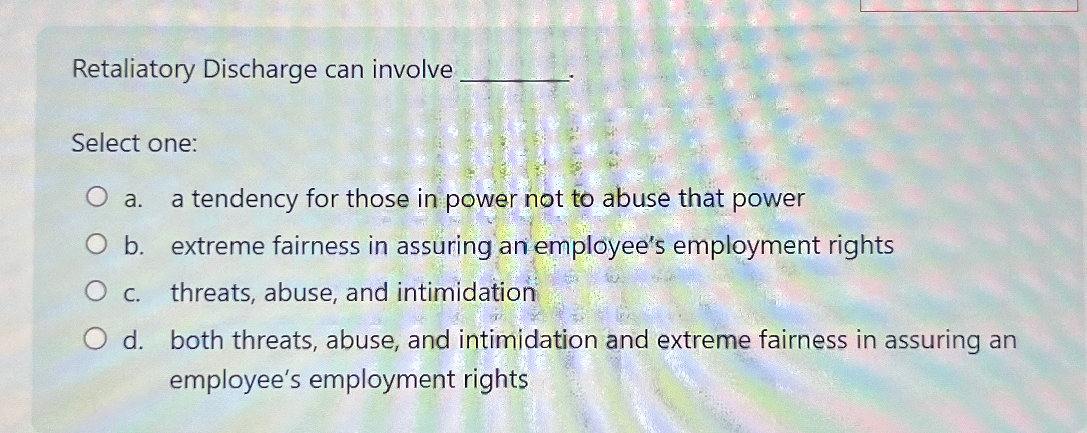 Solved Retaliatory Discharge can involveSelect onea. a