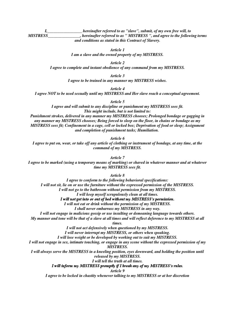 This contract is provided as a secure and binding agreement which defines in specific terms the. Topics bdsm, consensual enslavement collection.